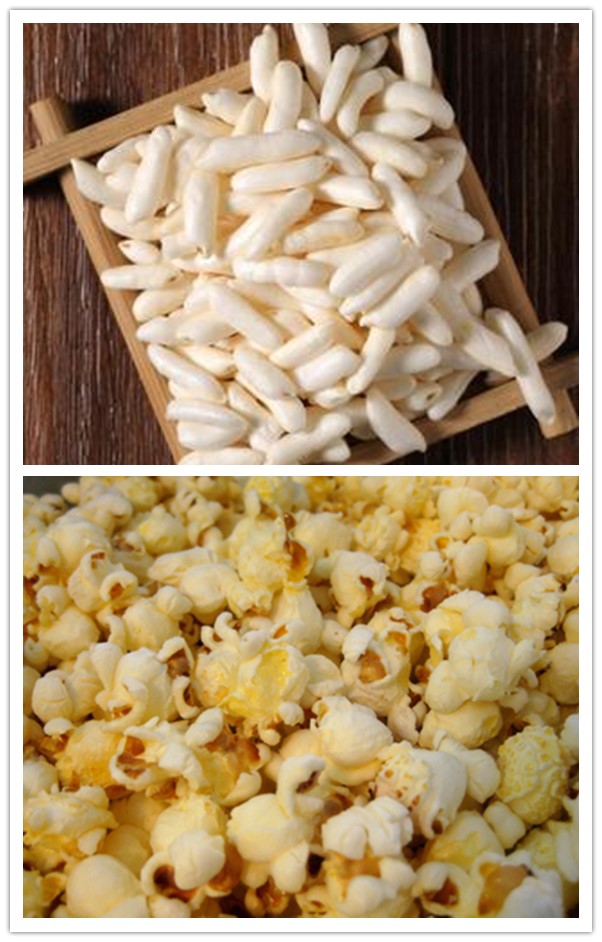Puffed rice machine in operation before the first warm-up cans for 10-15 minutes, then put some of the material inside the tank lid seal, blocking the lid, press the "switch" button, the tank will automatically uniform rotation so that the material evenly heated, with the continuous heating liquefied gas, the tank temperature is gradually increased, reaching more than 100 ℃, the surface material will escape the body of water and vaporized, the tank will be a certain pressure. When the material was charged with a moisture of about 5% to 8%, the pressure inside the tank will reach 0.8 ~ 1.25Mpa (different materials different pressure). In this case the material is cured in the tank if the tank lid burst open and the sudden release of high pressure high temperature down to room temperature and pressure, that moment released from the extruder outlet flow and transient bulging material, and at the same time produce a loud noise, sound reaches about 100 decibels.